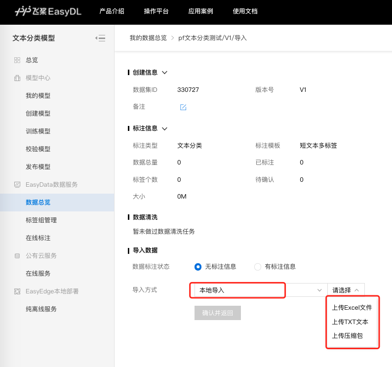 - 导入无标注数据时,选择需要导入的数据集名称,可导入其不带标注的全部数据,或未标注的数据