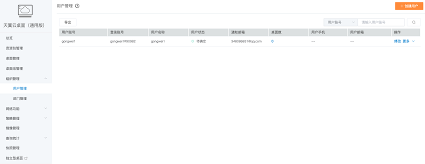 通过邮件通知激活的用户,您可以查看用户已有桌面数,也可以对已创建的用户进行修改用户信息、邮箱、数据导出、重置密码、解锁帐户、重发激活邮件、删除帐户等操作。