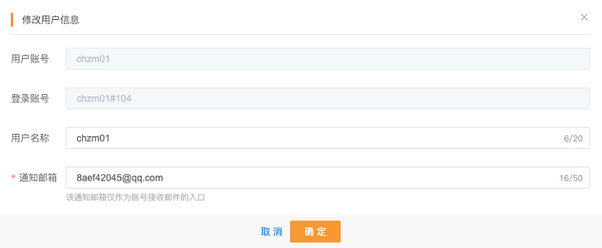 步骤 3 在需要修改邮箱信息的用户所在行,点击“修改”。弹出“修改用户信息”对话框: