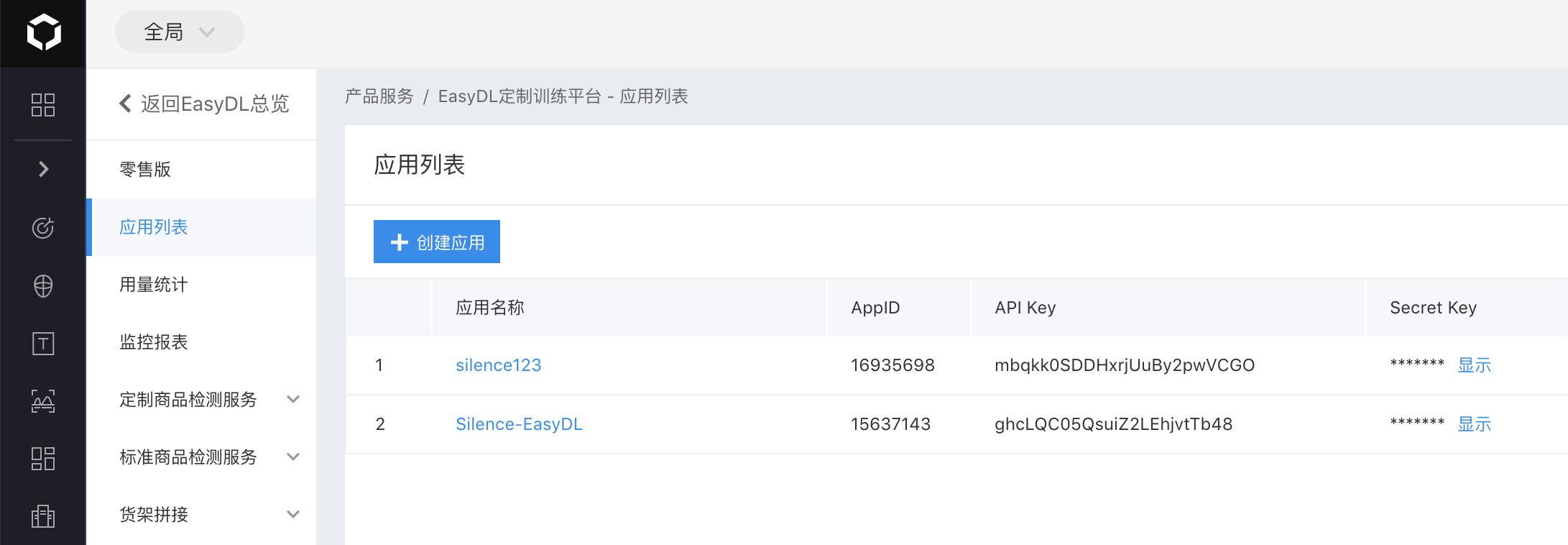 - 进入EasyDL零售版的百度智能云控制台应用列表页面,如下图所示: