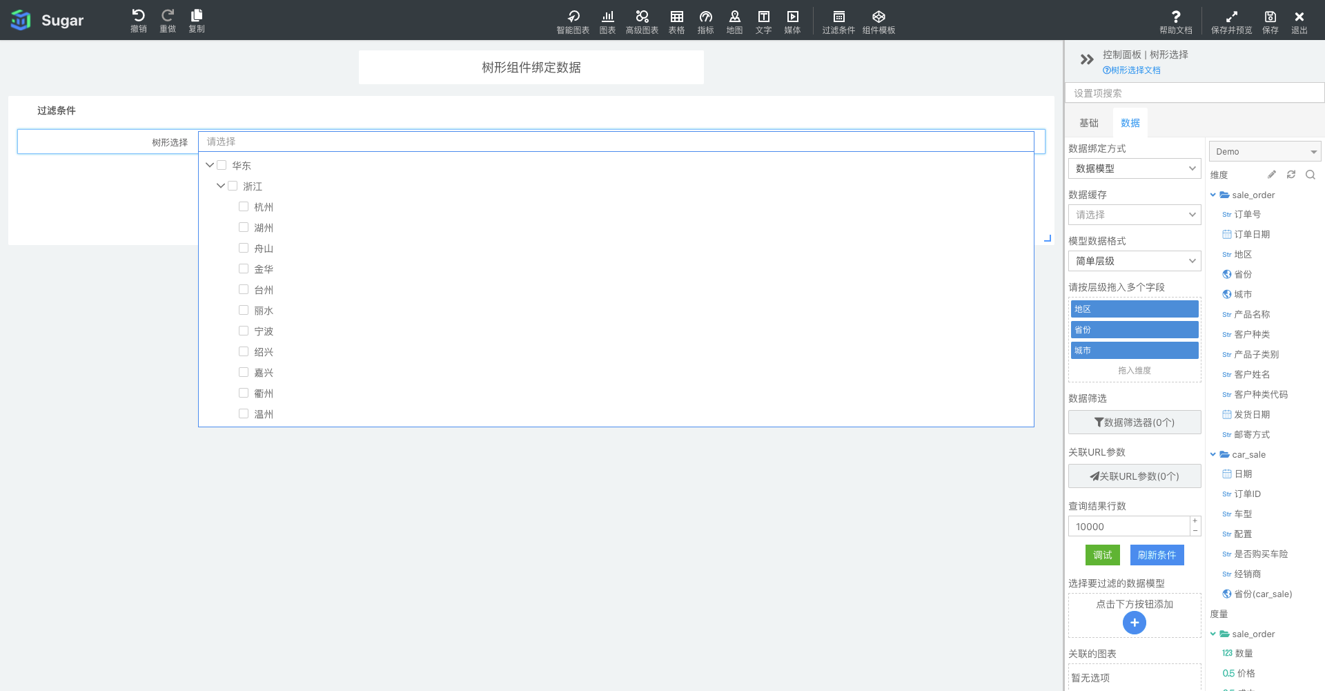 默认情况下,树形选择是多选模式的,当然您也可以配置为单选模式。使用数据模型绑定数据时,可以很简单的拖入多个层级字段,如下图: