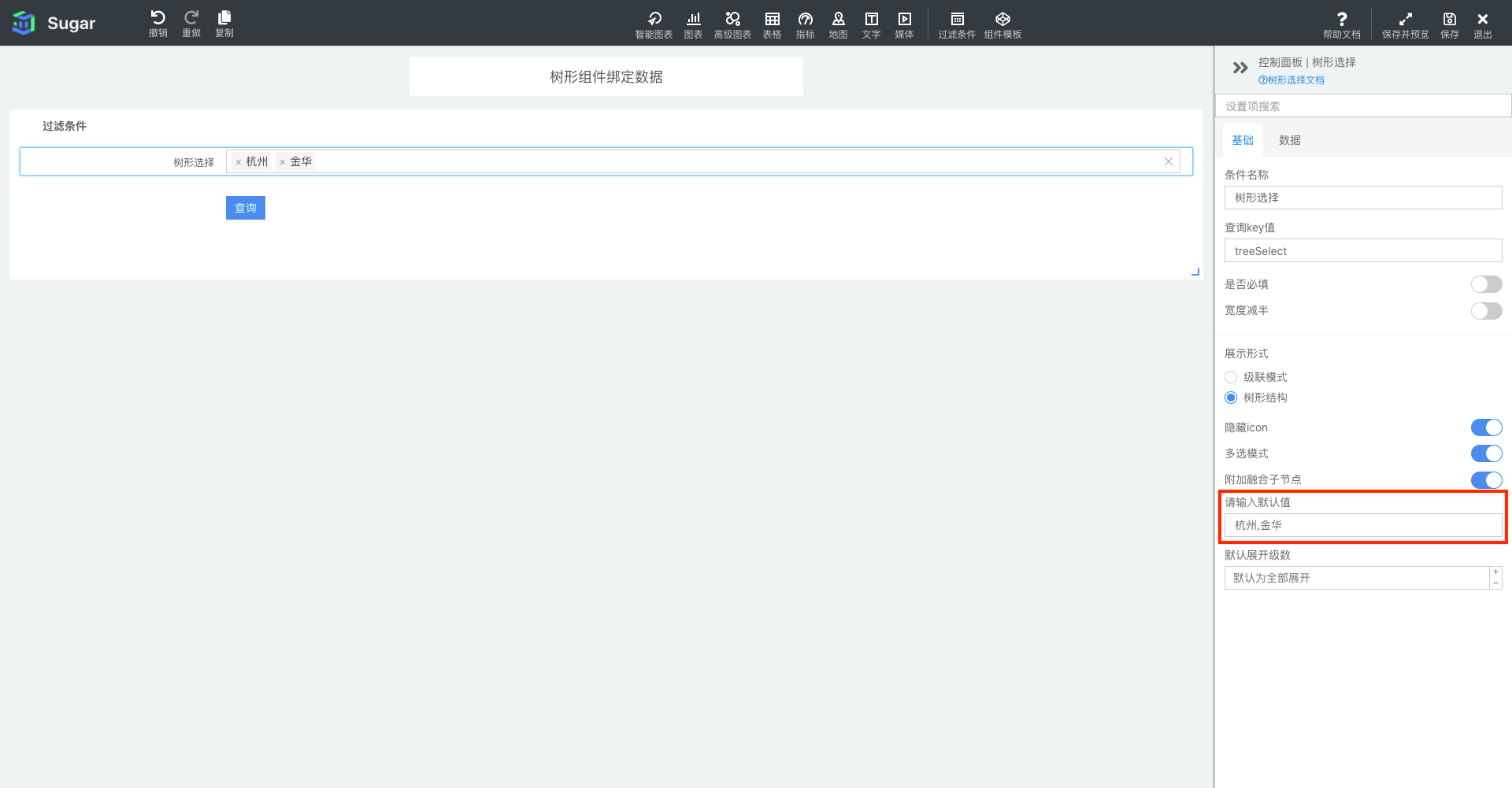 树形选择可以设置默认值,输入默认想选中的项的取值即可,如果是多选则使用英文逗号分隔: