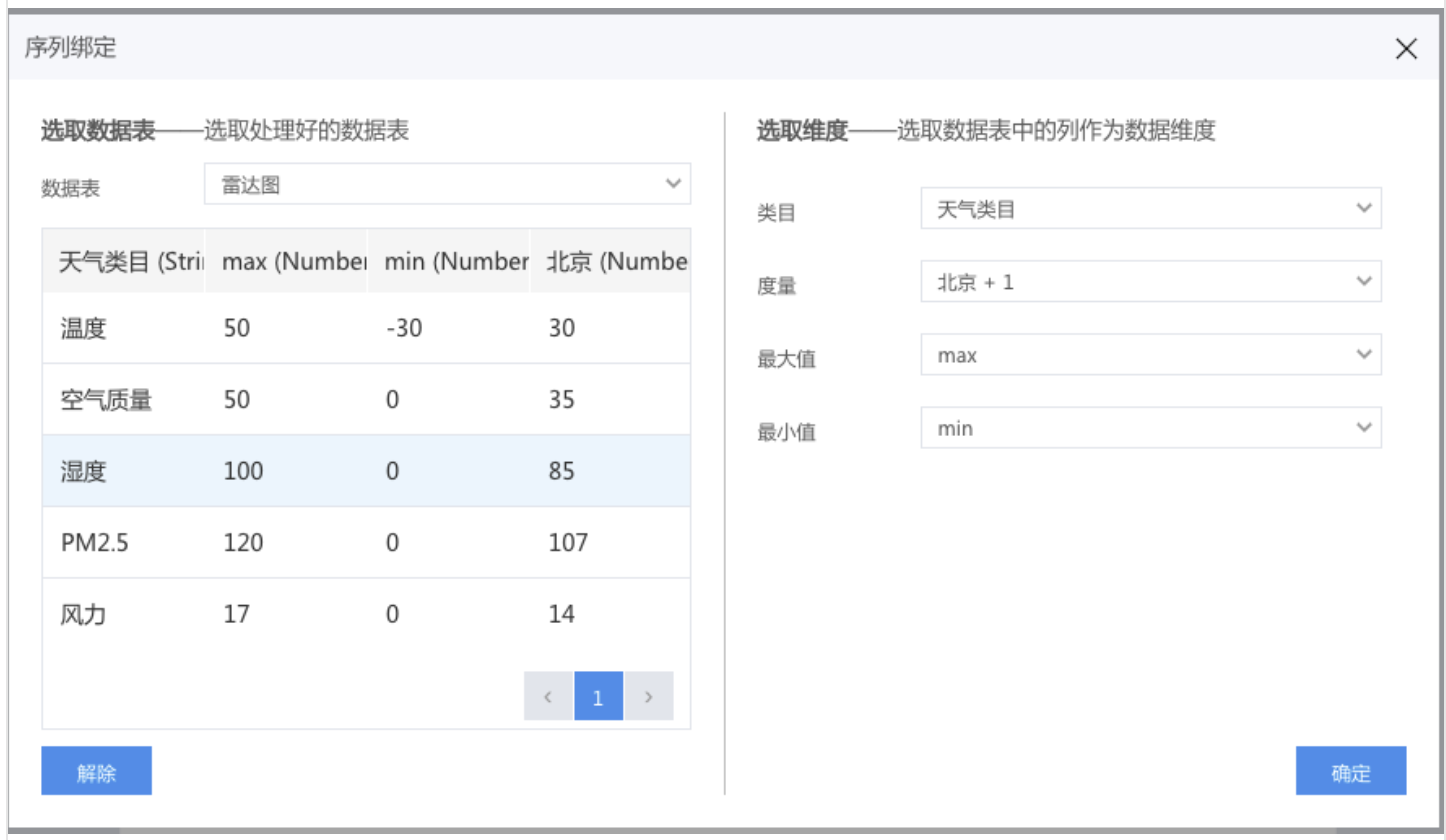 数据配置,亦称数据绑定,是连接『可视化仪表盘』与『数据表 的窗口。数据配置Tab中可供选择的数据表,是已在数据表Tab中创建好的二维数据表。数据表的创建过程可参考仪表盘数据表处理 及 典型实践文档。