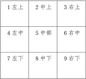 水印打在图的位置,位置如区域数值对应表所示。 整数形式,取值范围是:1~9。默认值:9,表示在右下角打水印 。 |