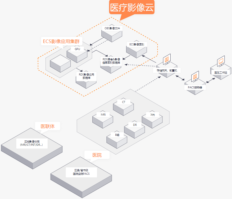 影像设备上扫描出来的DICOM格式数据经NFS/CIFS保存在存储网关本地盘缓存。影像数据通过云专线异步转发/归档到对象存储中。通过ECS影像应用集群,患者可以在线查看自己的影像和报告,医生可以院外移动看片等。GPU云主机或C3高性能云主机可以支持医生在线阅片时进行图像处理、三维图像重建等。