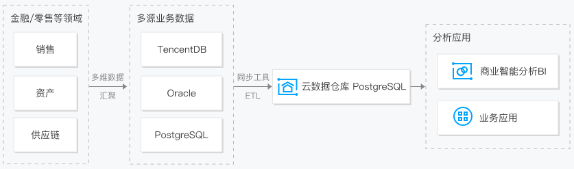 通过同步或 ETL 工具将分散在 TencentDB、Oracle、PostgreSQL 中的数据导入到云数据仓库 PostgreSQL 中,利用其对多源异构数据的分析能力,辅助业务决策。