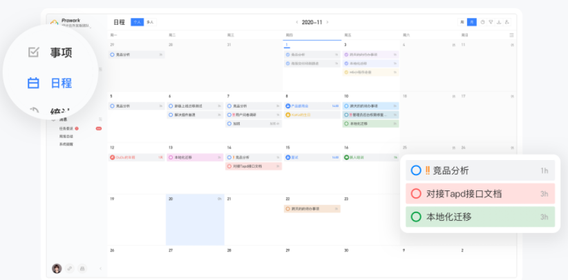 ProWork 为团队中的不同角色提供支持,团队成员可以通过任务清单功能进行个人日程管理,项目经理可以通过多人周历、会议演示、排期邮件等功能进行项目协作,管理者也可以通过跨项目的全局视角,掌握团队整体进度。