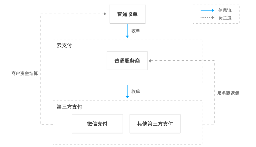普通服务商可通过云支付直连微信支付等第三方支付,服务商需在微信支付等第三方支付平台申请商户号,再将商户信息录入到云支付,即可接入。
