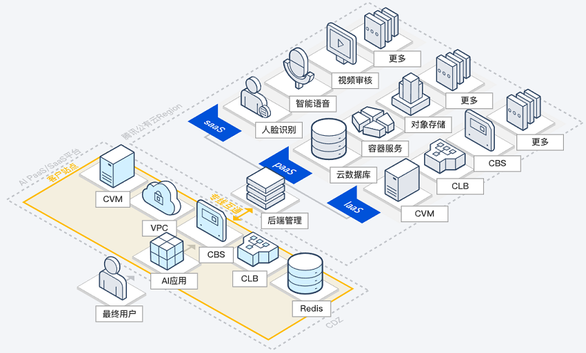 适用于应用软件厂家,期望借助公有云搭建独有的 PaaS 或 SaaS 平台。例如,AI 平台、ERP 平台、CRM 平台等。可借助腾讯云标准基础建设及云上管控运维能力,以较少的人力投入快速搭建其业务平台。