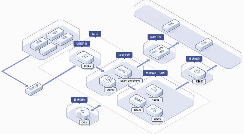 以MRS一站式大数据平台为核心,利用大数据实时接入Kafka,实时分析Storm,海量存储HBase等组件,完成海量的数据信息采集与分析处理过程,为政府、企