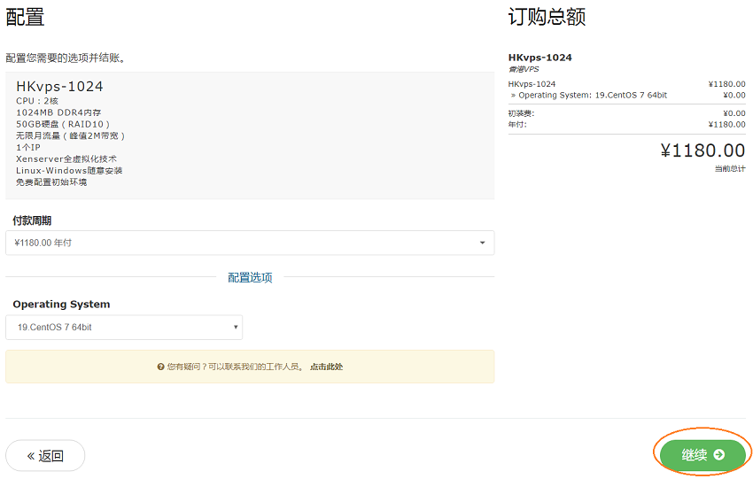 这里选择的是“年付”,“CentOS 7 64bit”,然后点击“继续”